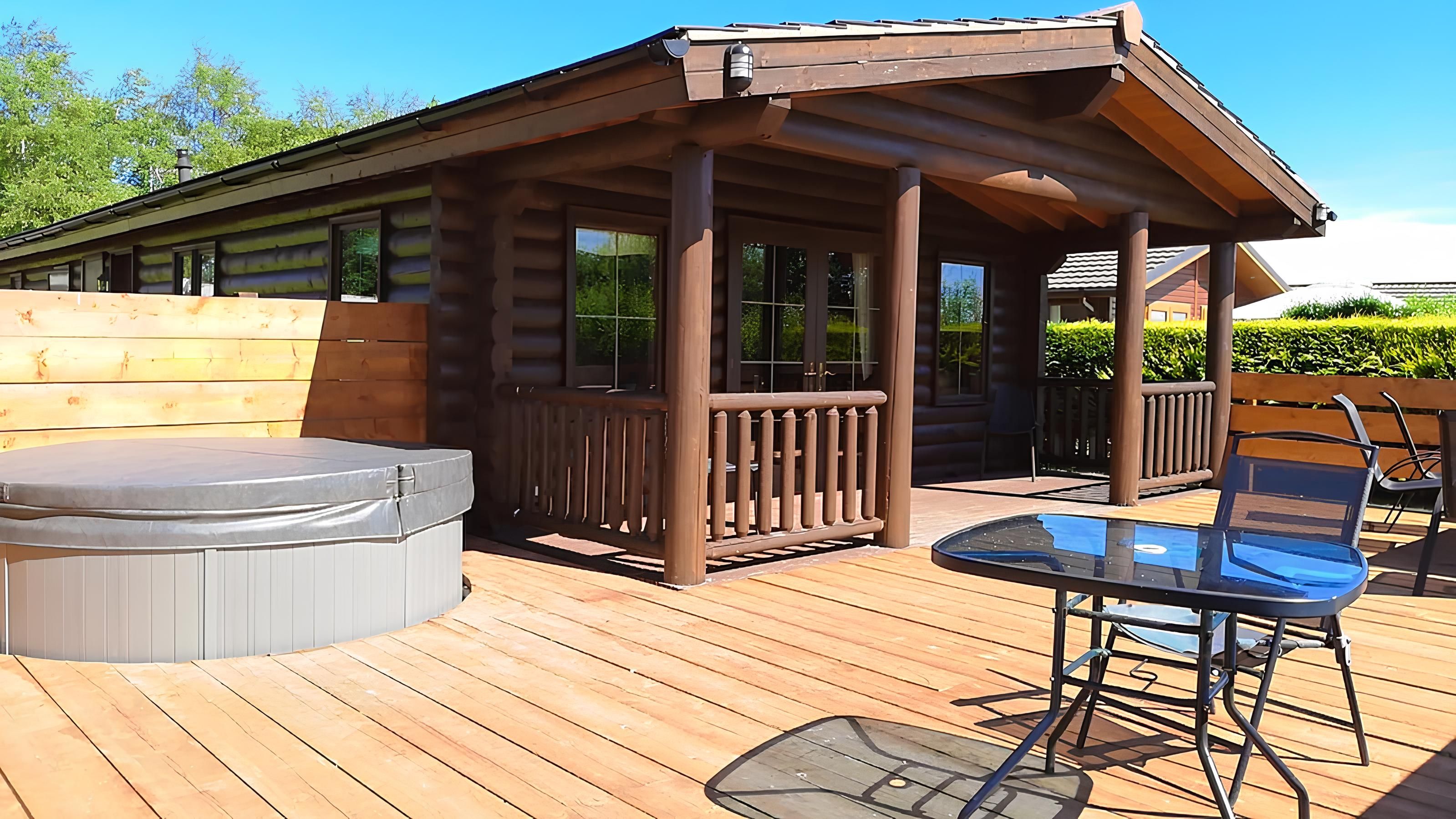 A luxury Estonian pet friendly log cabin with three large double bedrooms. Contemporary design with a spacious open plan lounge, kitchen and dining area. The lodge is filled with natural light that streams in from large windows throughout. The lodge has a private hot tub with a decking area, luscious garden and stunning views across the fishing lake. The perfect setting to relax and unwind.
