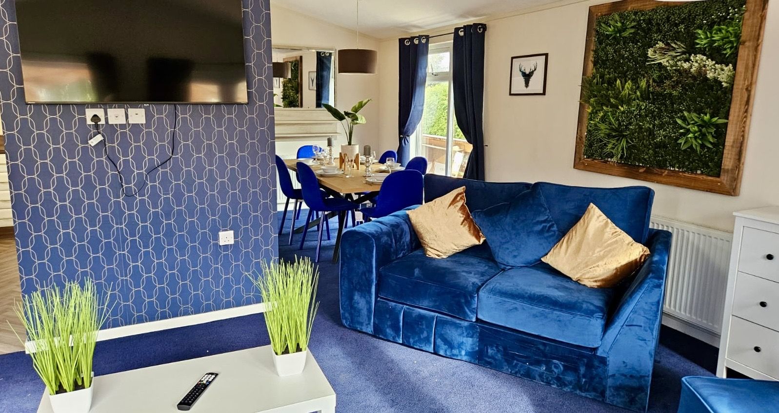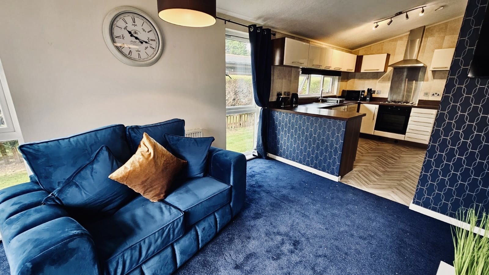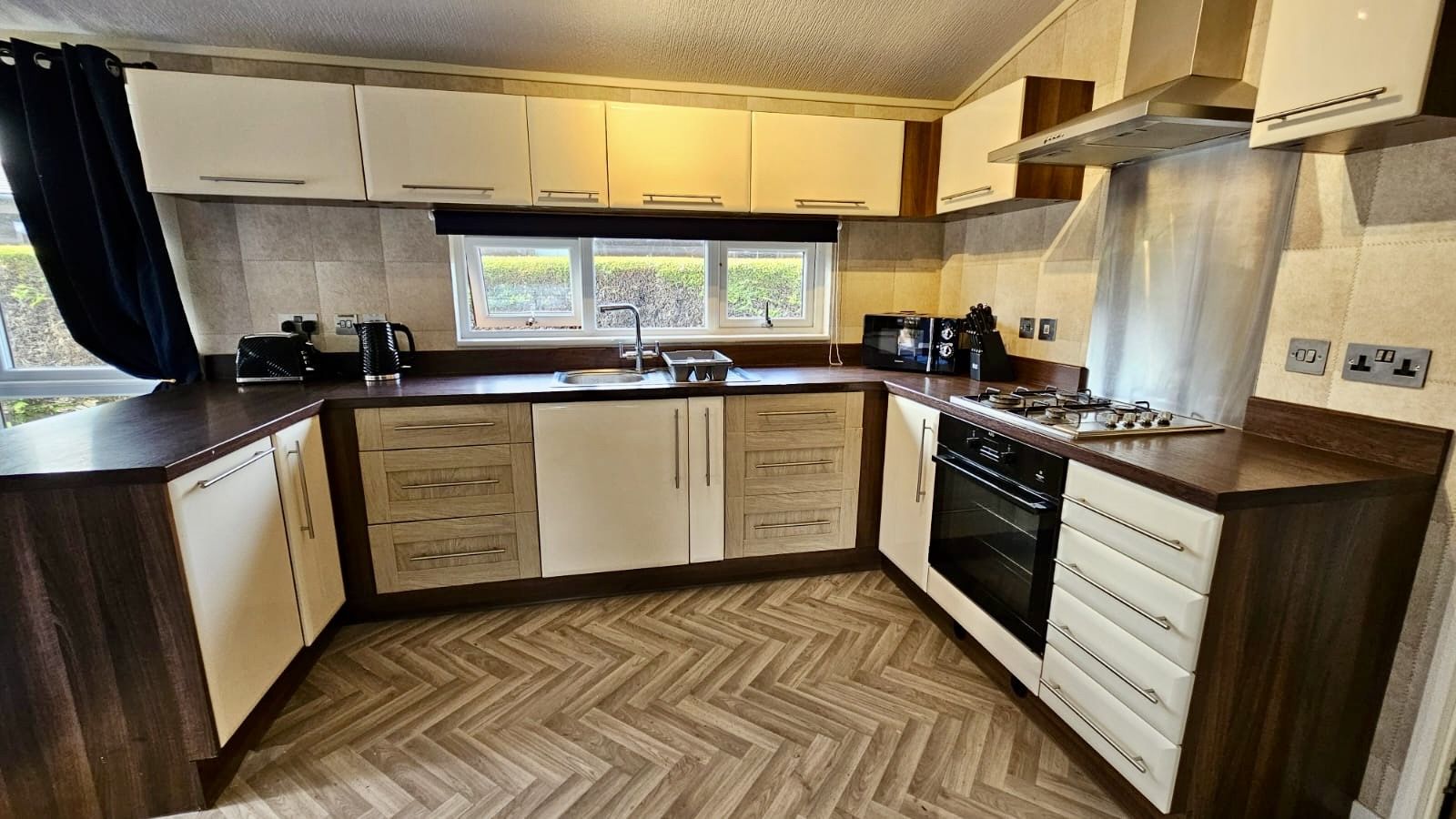 An elegant and contemporary lodge with a master double with en-suite bathroom and a twin bedroom. Stylish open plan lounge, kitchen and dining area with patio doors leading to decking area with outdoor hot tub.