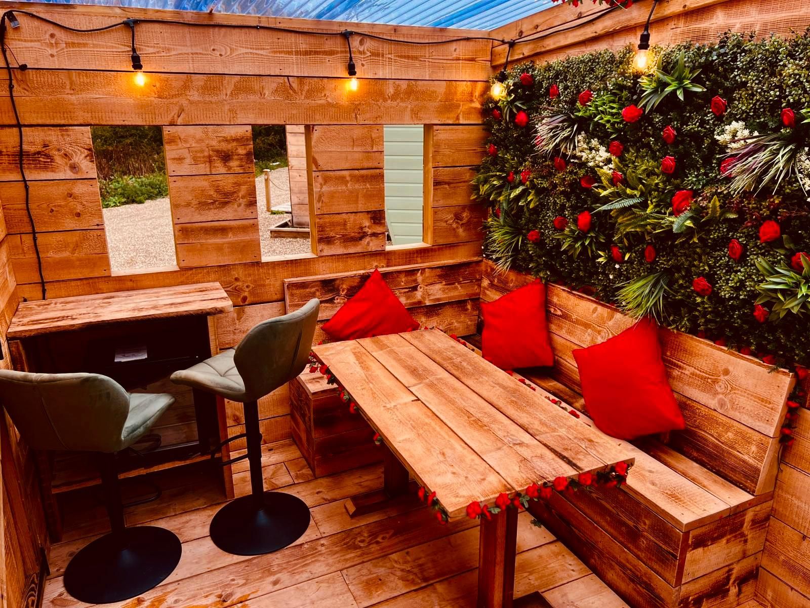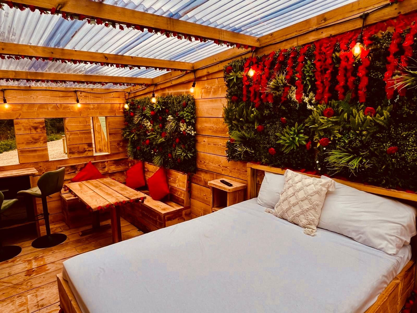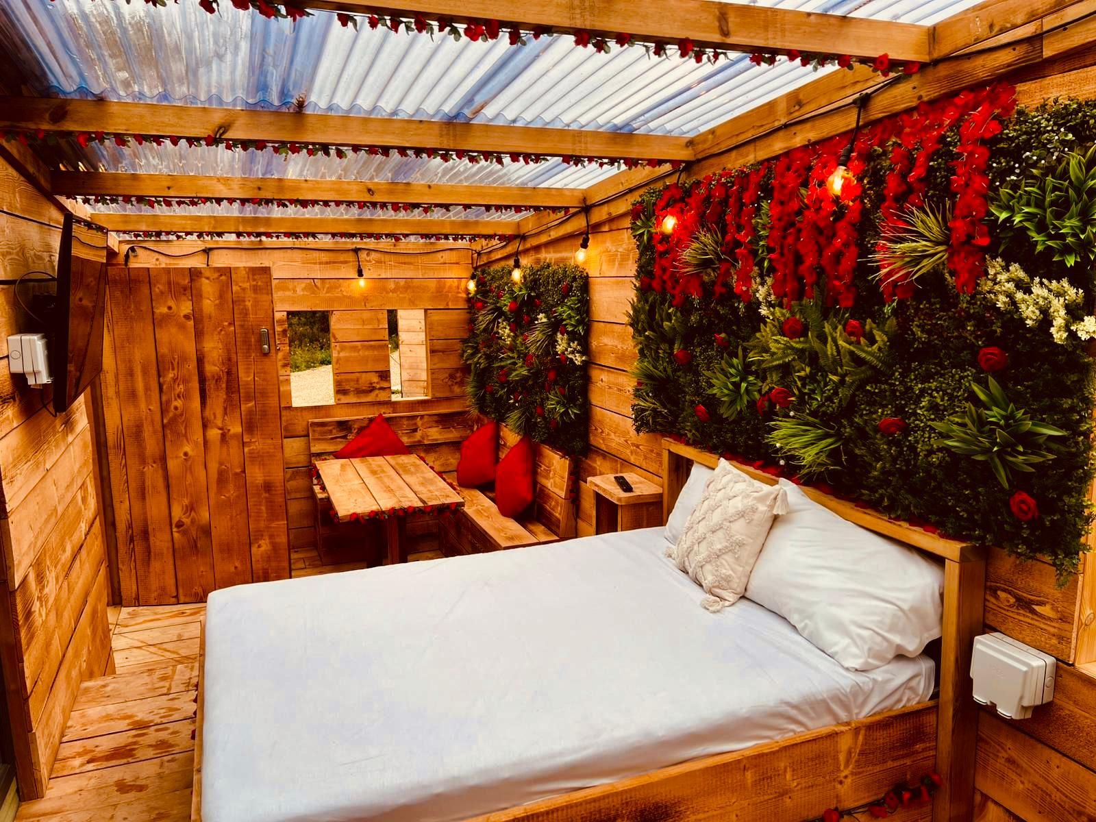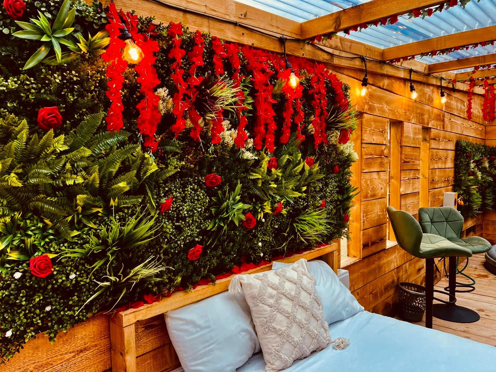 Slip into your private outdoor hot tub, beautifully framed by a living wall of greenery and roses, and enjoy the tranquil atmosphere as fairy lights twinkle above. Inside your private retreat, unwind on the luxurious double day bed or enjoy a cosy film night on the large wall-mounted TV, perfectly positioned for viewing from the hot tub or bed.