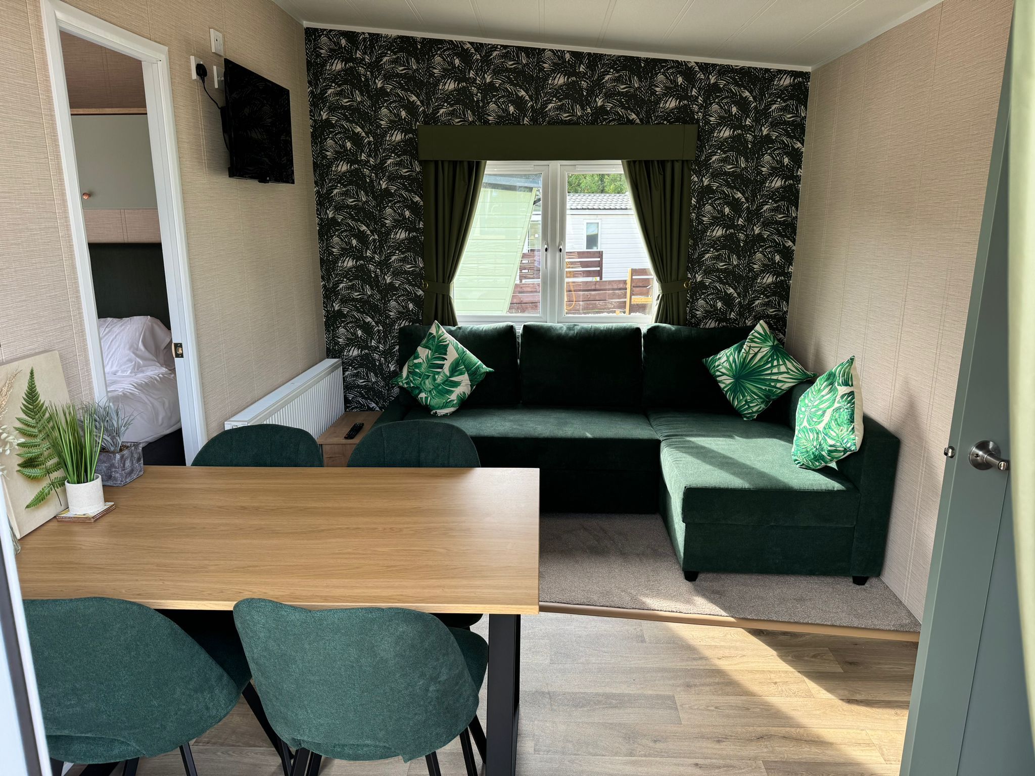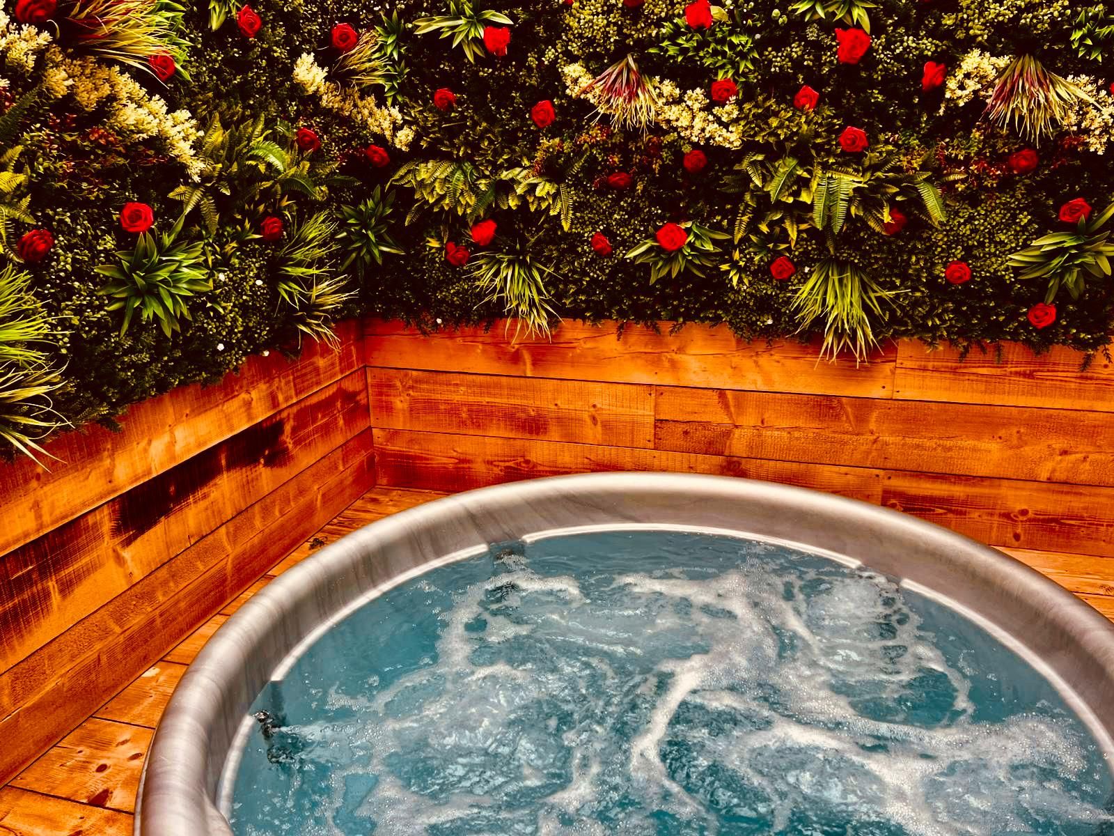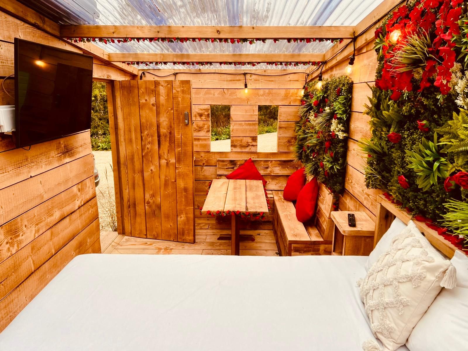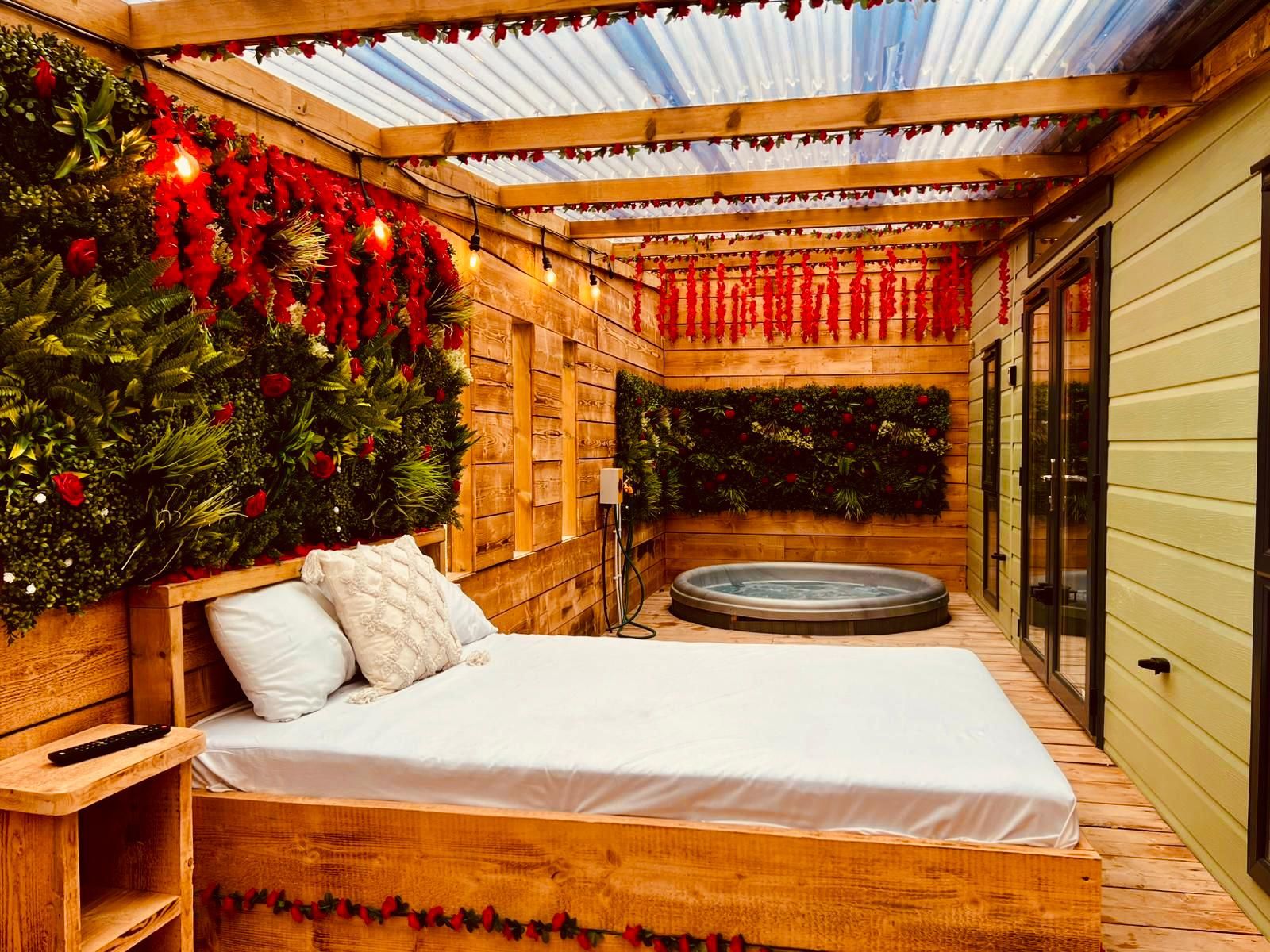 Slip into your private outdoor hot tub, beautifully framed by a living wall of greenery and roses, and enjoy the tranquil atmosphere as fairy lights twinkle above. Inside your private retreat, unwind on the luxurious double day bed or enjoy a cosy film night on the large wall-mounted TV, perfectly positioned for viewing from the hot tub or bed.