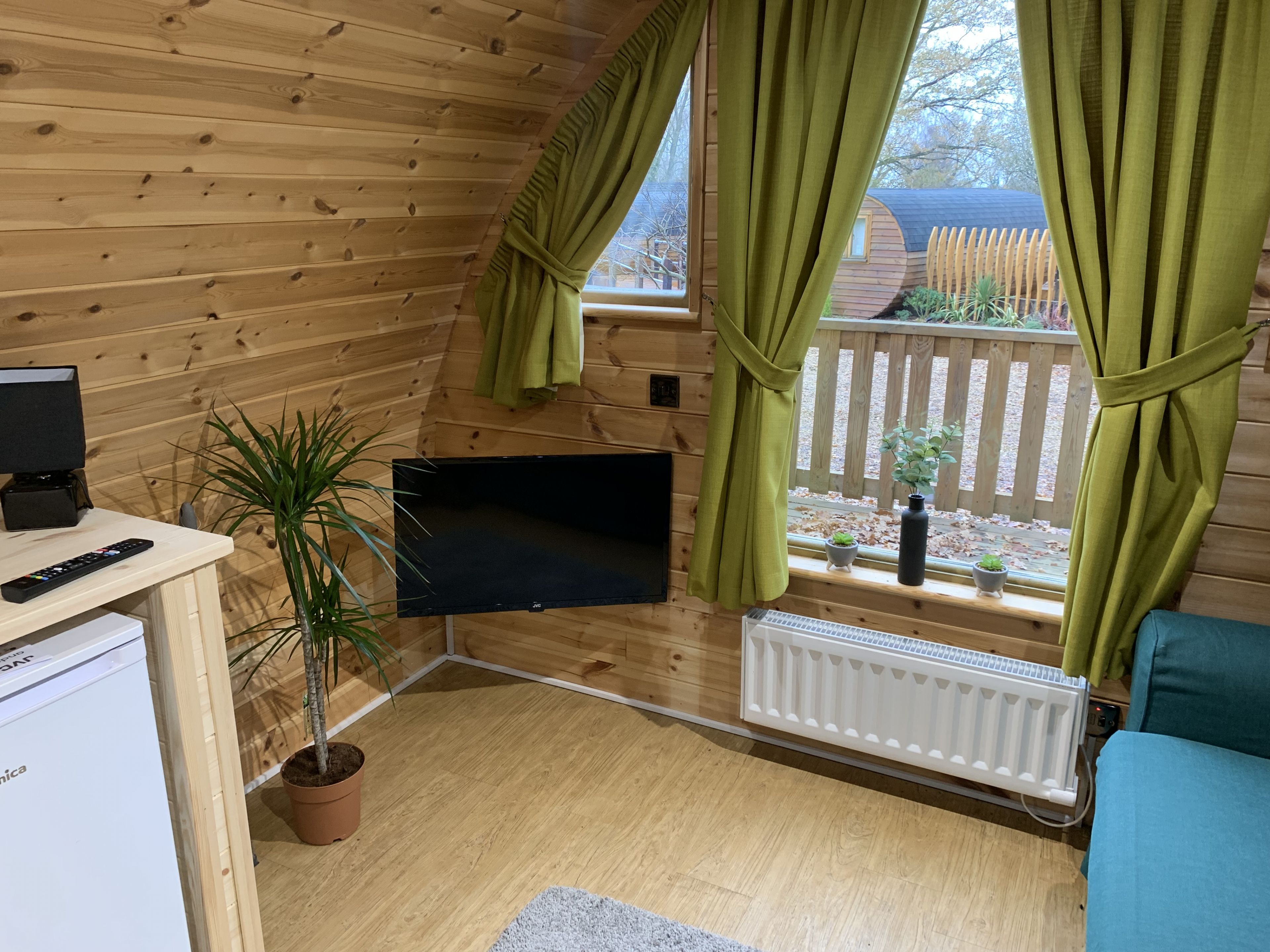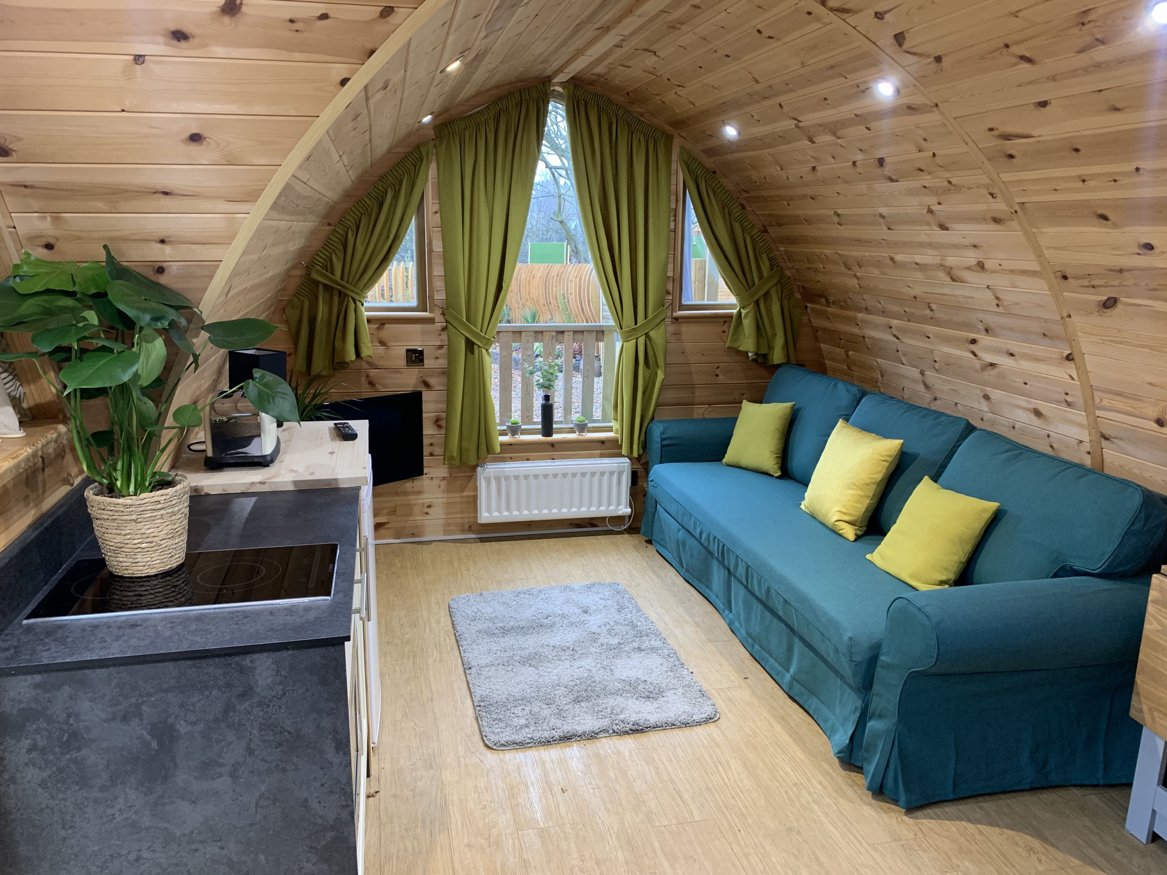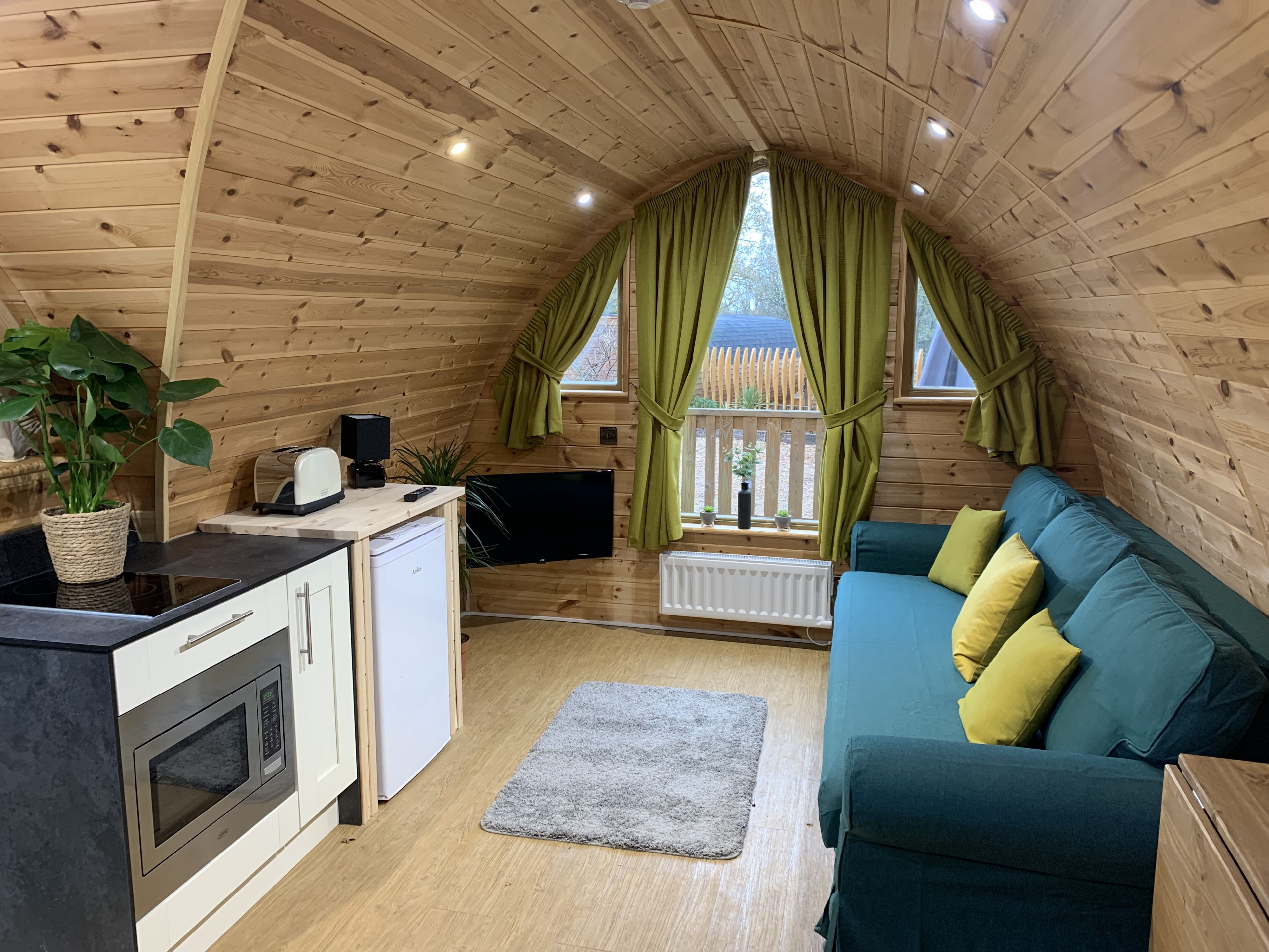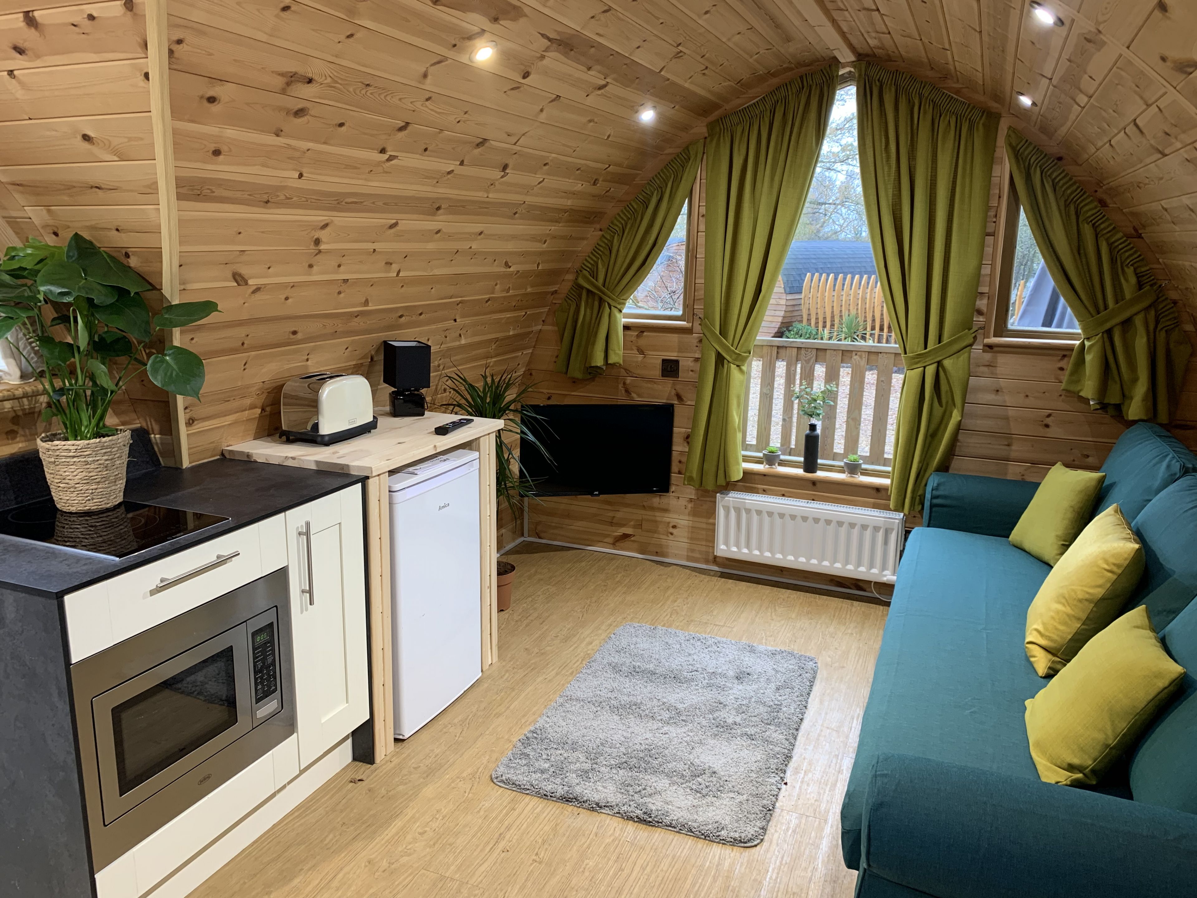 Our Acorn Pods are a popular accommodation type suitable for couples, friends, solo customers to enjoy the perfect break. Inside the pod is an open plan living area with 1 double bed, a mini kitchen with a microwave oven and fridge.
