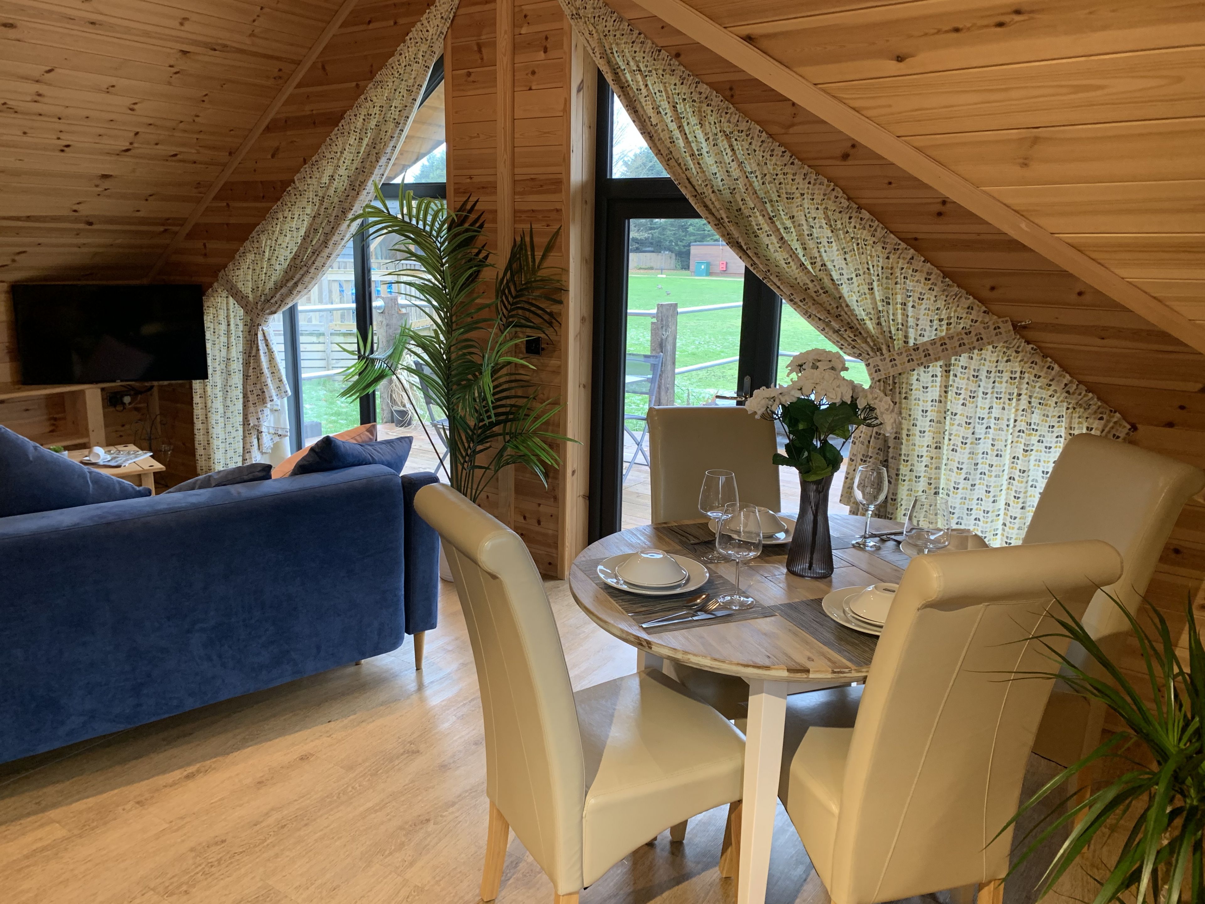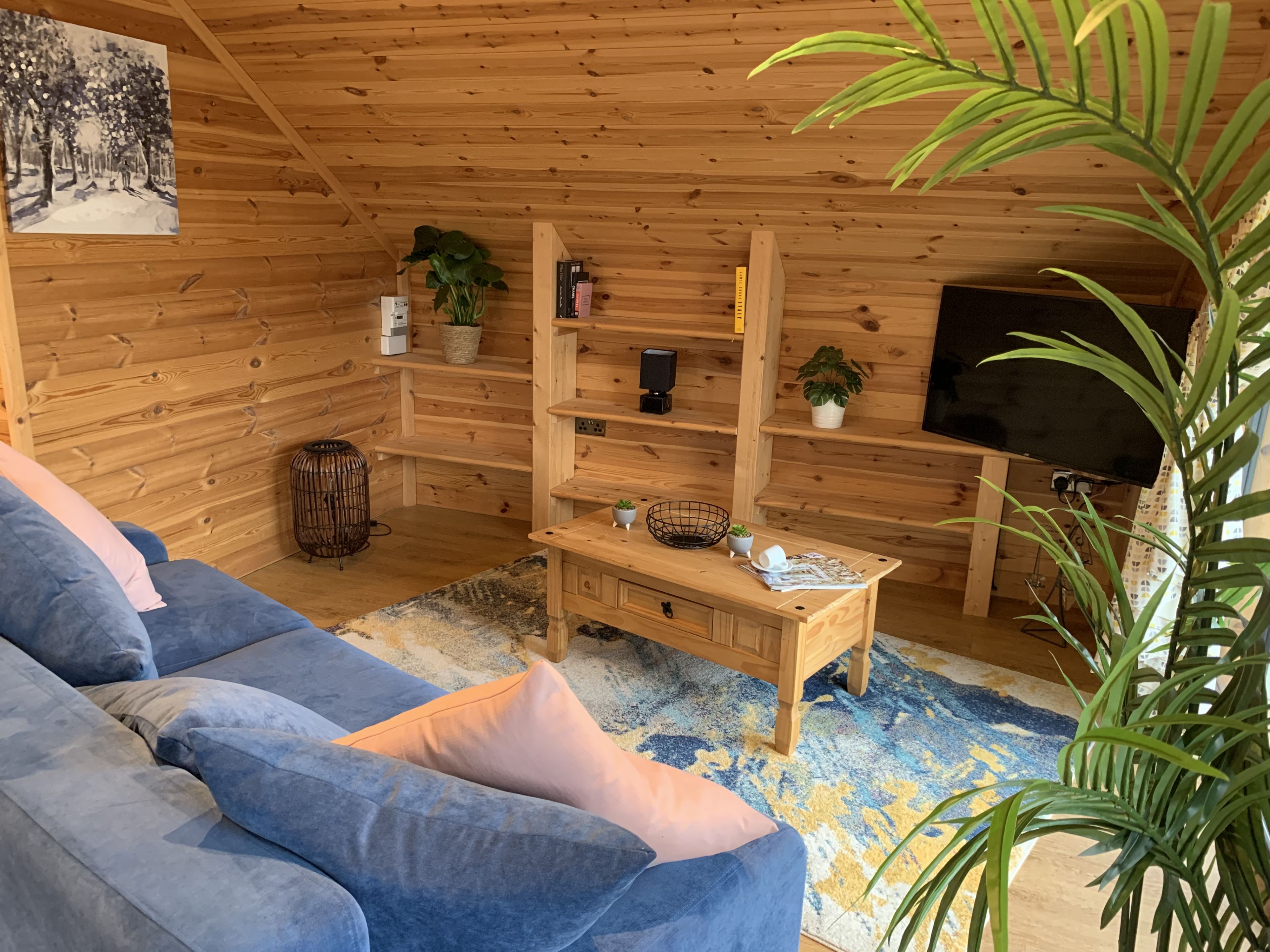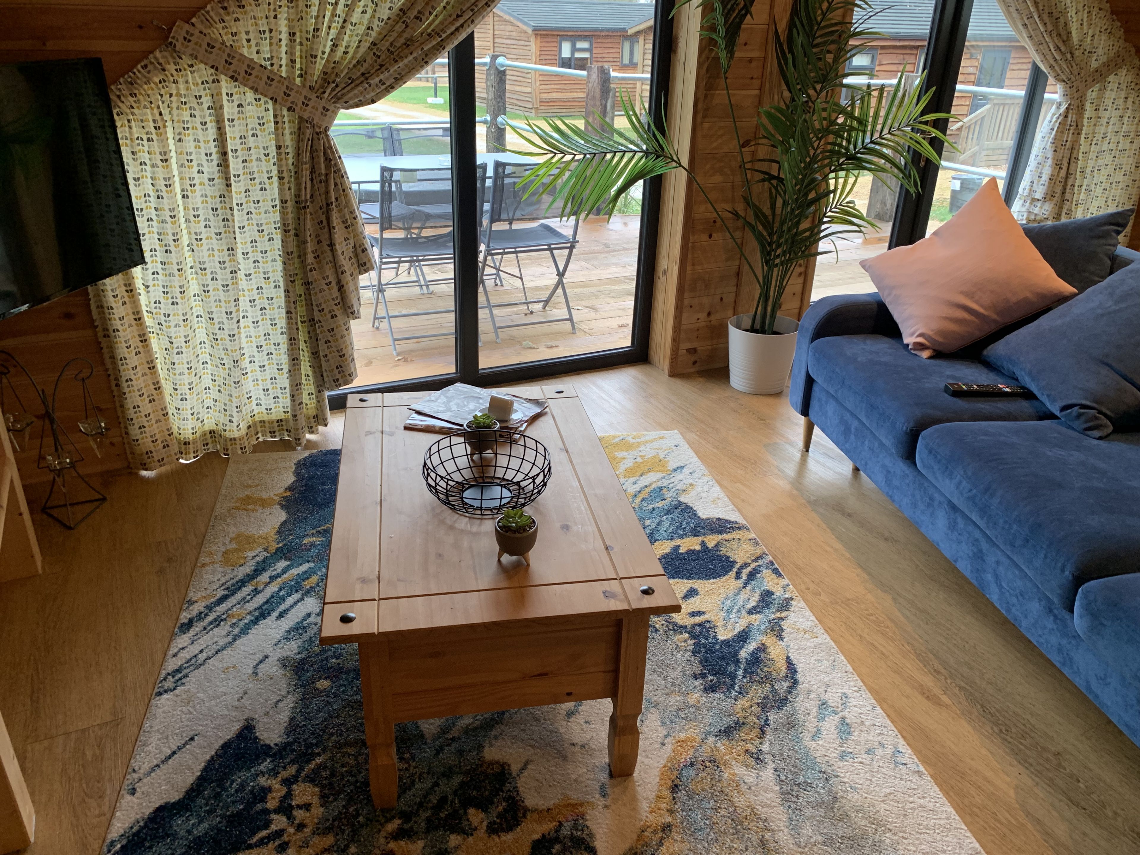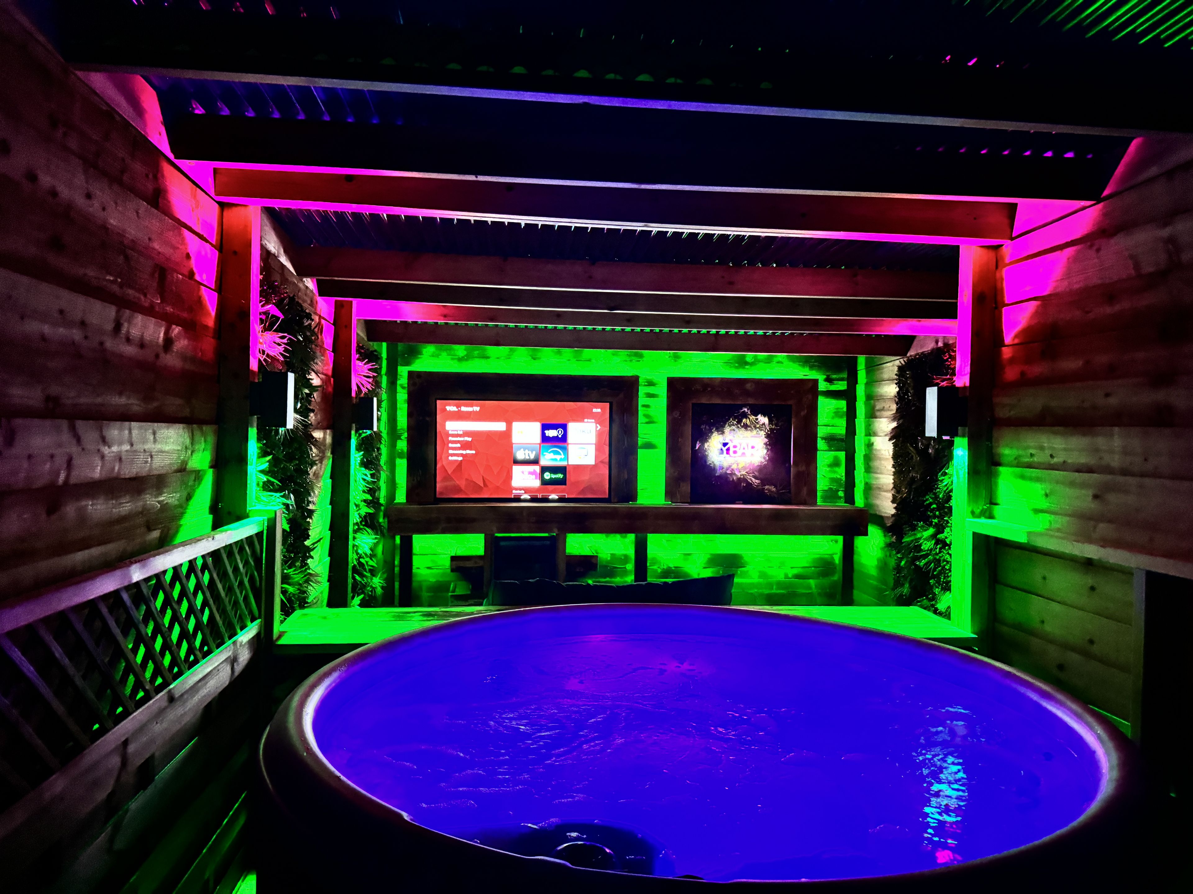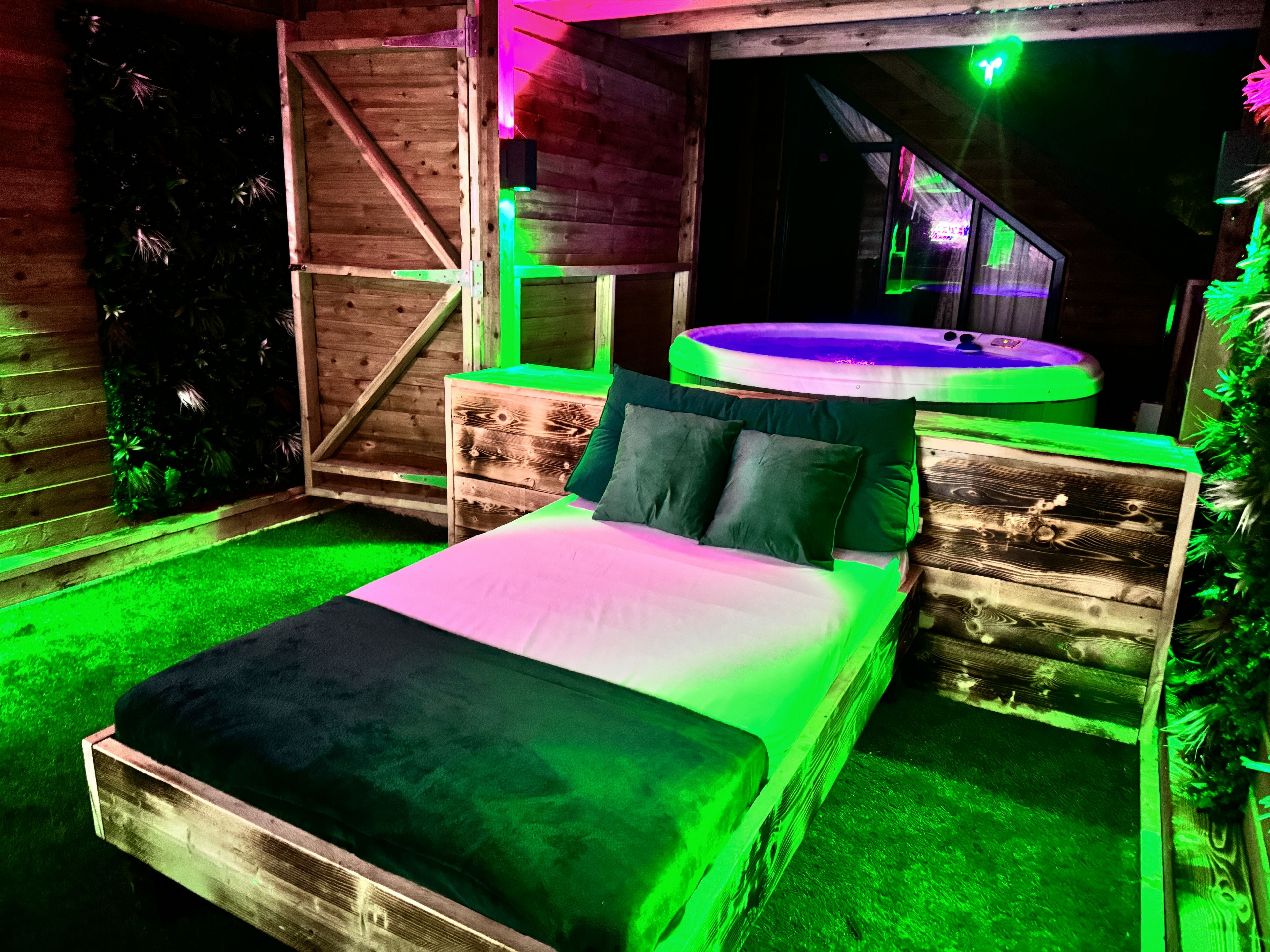 Step out onto the spacious deck to experience the exclusive features of our secret retreat. Alongside a luxurious hot tub perfect for private relaxation, the deck boasts a massive 65" outdoor TV and a comfortable day bed, making it an ideal spot for outdoor entertainment and lounging. Featuring a beautifully enclosed garden adorned with lush foliage, the lodge offers a secluded outdoor space where luxury meets tranquillity.