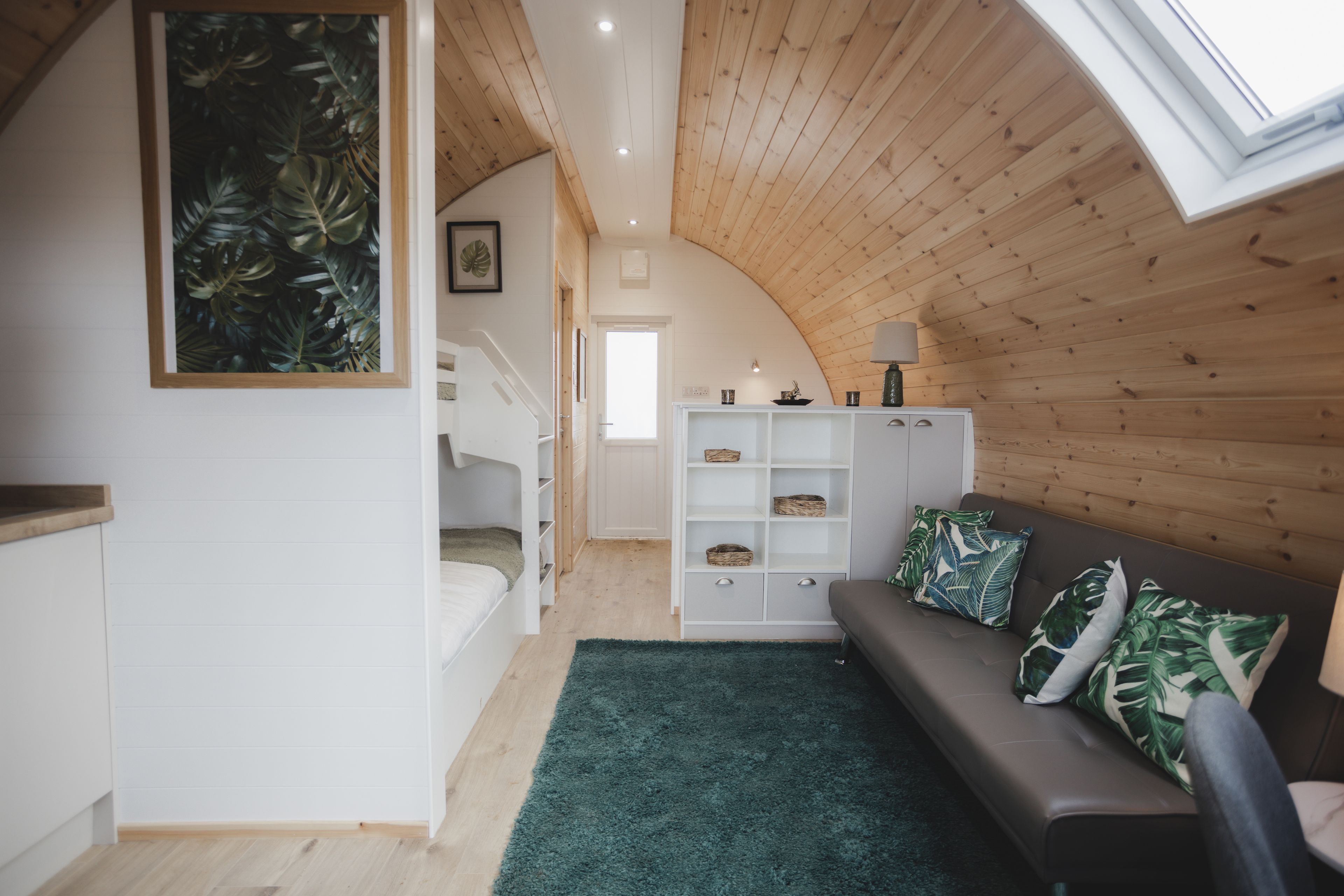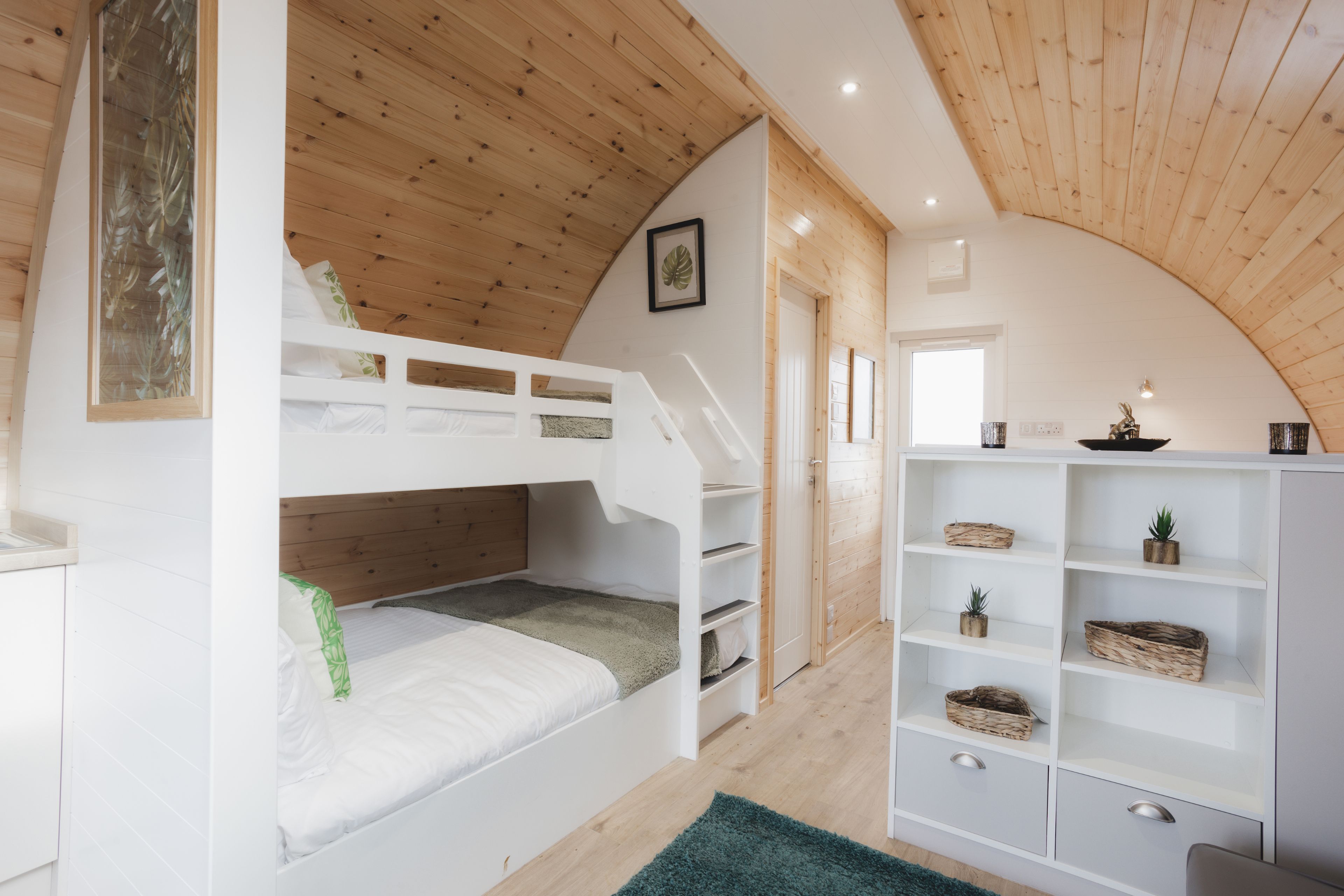 The Windsor at Woodlakes: Experience the epitome of modern glamping in our XL pod. This spacious accommodation offers 1 double bed and bunk beds, making it perfect for families. Step outside to your enclosed garden area, complete with a private hot tub and a fire pit.